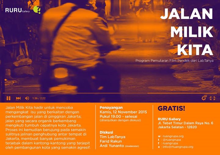 Jalan seringkali dianggap sebagai properti yang sepenuhnya dimiliki, dikembangkan dan dikuasai oleh negara. Sementara masyarakat hanya memiliki hak guna atasnya, tidak lebih. Anggapan ini pada akhirnya akan menciptakan jarak serta menutup potensi jalan yang sesungguhnya: jalan sebagai ruang bersama.