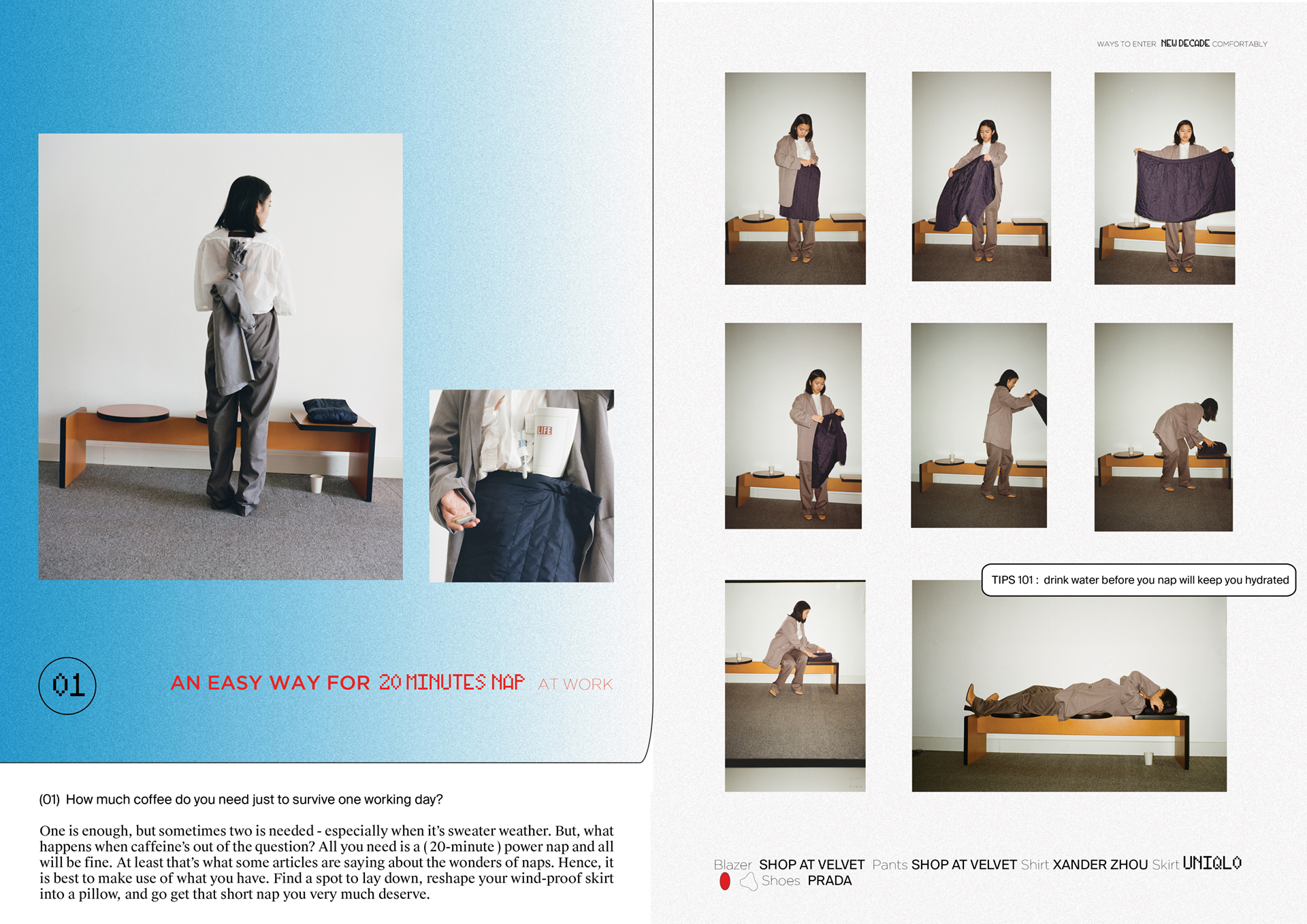 How much coffee do you need just to survive one working day? One is enough, but sometimes two is needed – especially when it’s sweater weather. But, what happens when caffeine’s out of the question? All you need is a 20-minute power nap and all will be fine. At least that’s what some articles are saying about the wonders of naps. Hence, it is best to make use of what you have. Find a spot to lay down, reshape your wind-proof skirt into a pillow, and go get that short nap you very much deserve.
